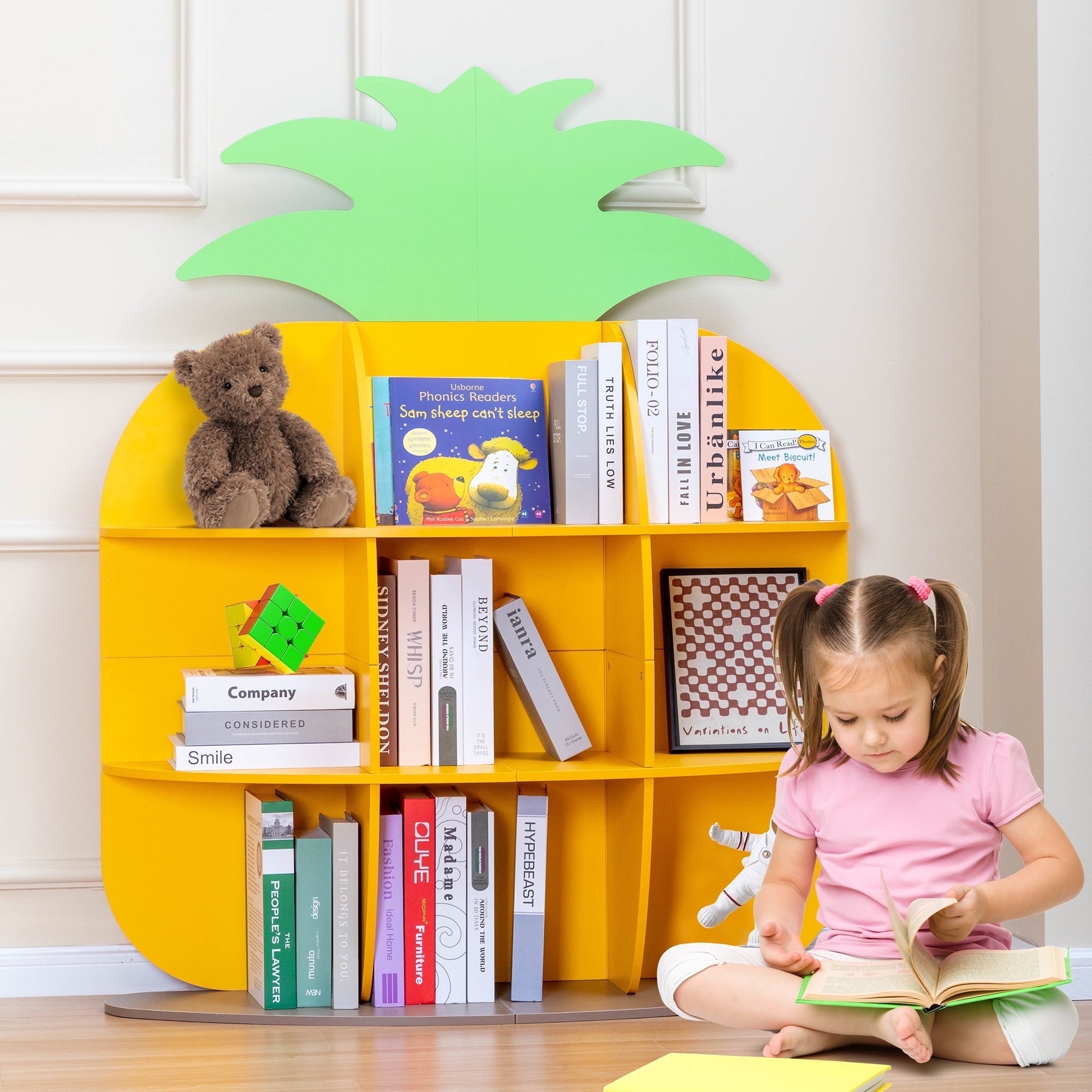 This pineapple-shaped kids bookshelf is both a playful décor piece and a practical storage solution. With 9 spacious cubbies, it easily stores books, toys, art supplies, and display items, supporting up to 130 lbs in...