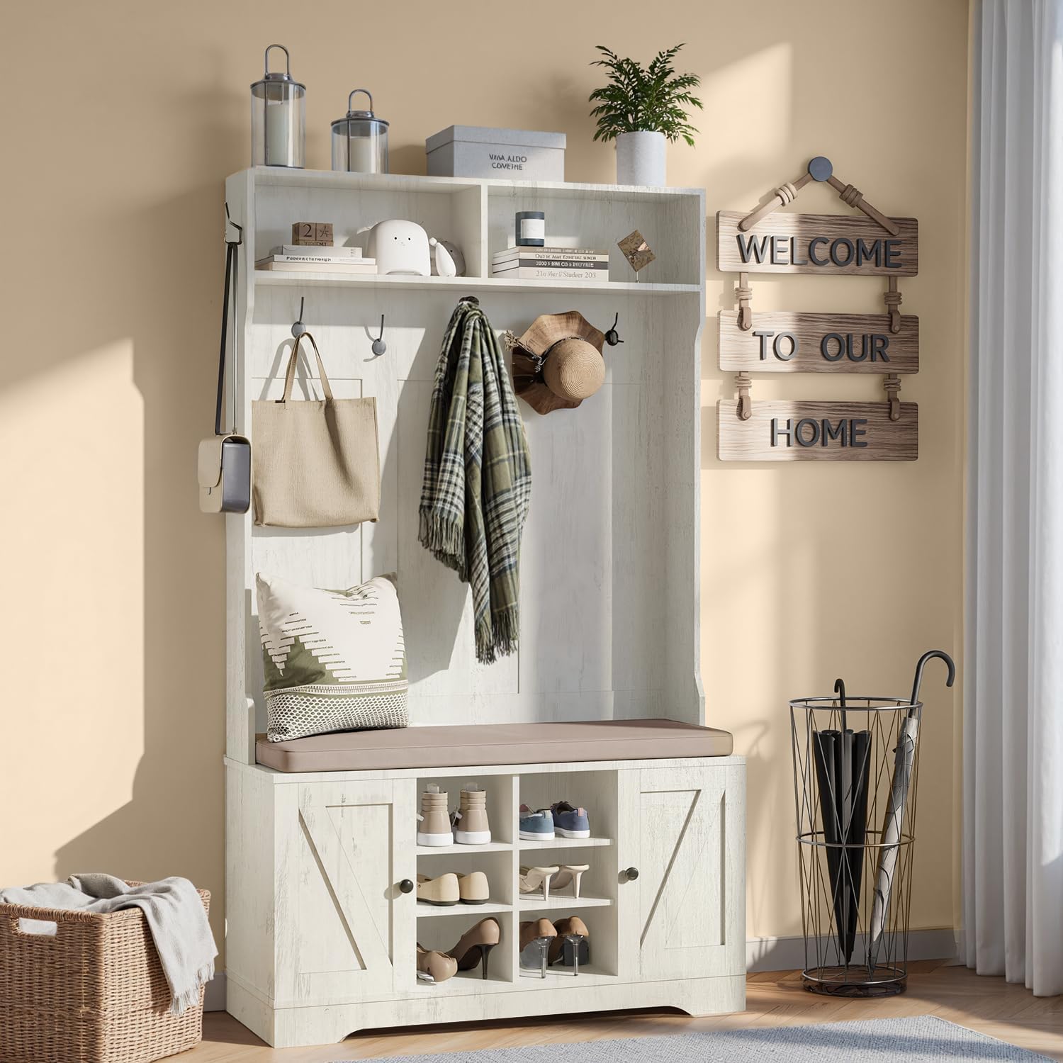 71" Hall Tree with Bench and Shoe Storage, Entryway Hall Tree with 2 Doors and 6 Adjustable Shelves, Cushioned Storage Bench with Coat Rack for Hallway, Living Room, Mudroom