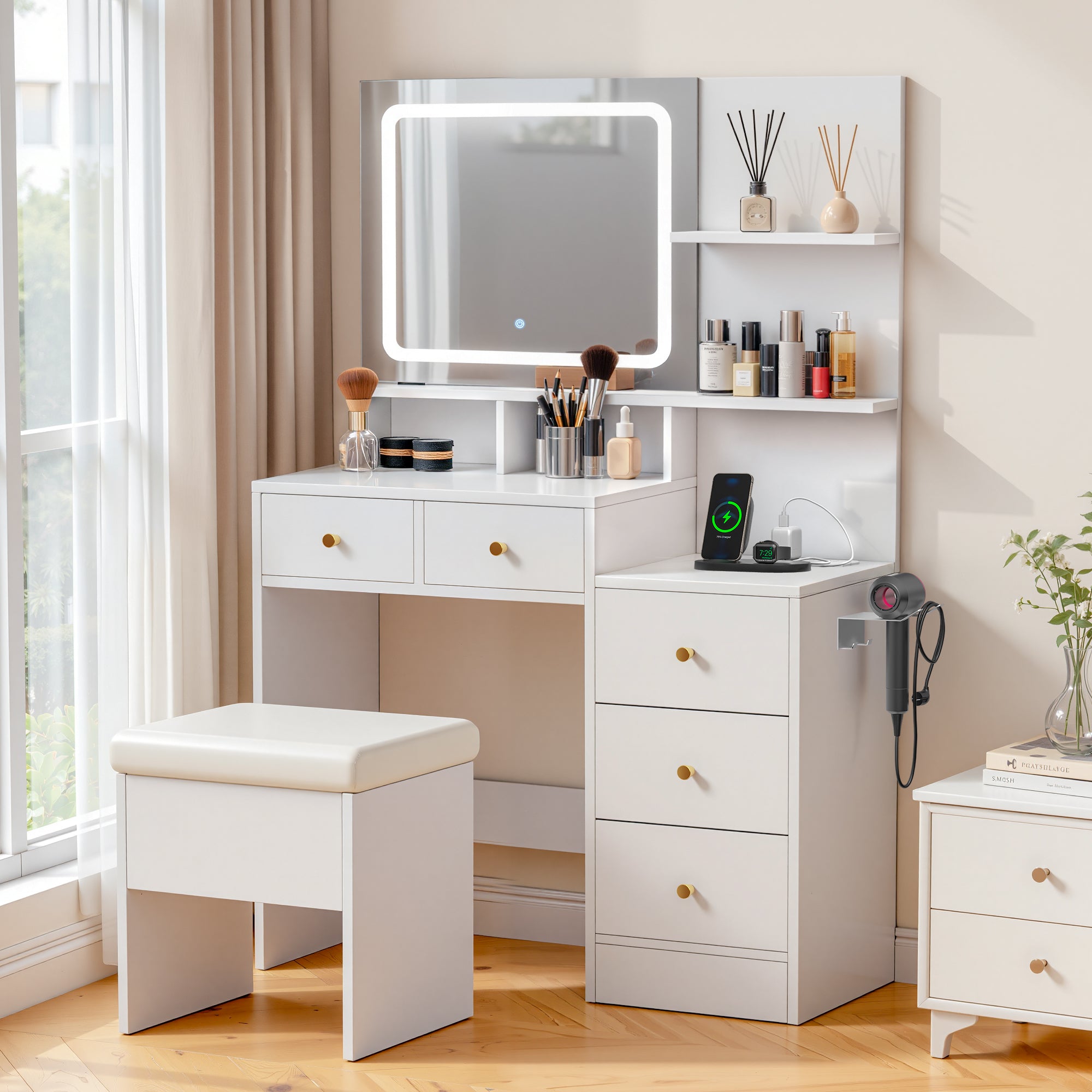 spanspace 70.9" Kitchen Pantry Cabinet with Power Outlet and LED Light, 2 Drawers Buffet Storage Cabinet with Glass Doors and Adjustable Shelves for Dining Room Living Room, White